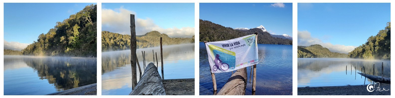 Unos kilómetros más adelante, el Lago Falkner -pegadito a la ruta- nos interpela. Aprovechamos para hacer un stop, descansar y colarnos en el paisaje. Es momento de una “paradita técnica” y de nuestra tertulia de cada día. Mate va, mate viene, surgen nuevas historias y relatos de vida. Pareciera que nunca se agotan, en un “fogón” imaginario.